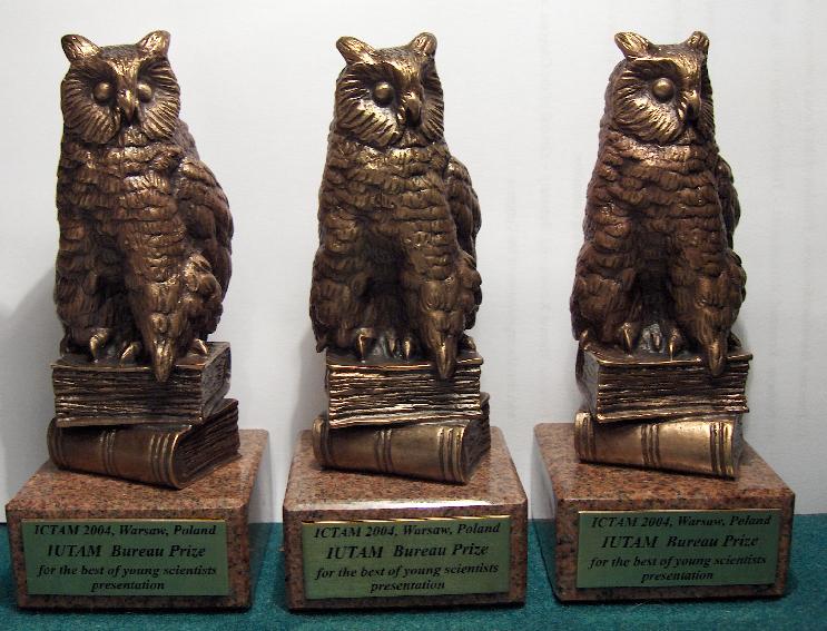 The members of the Bureau of IUTAM were listening throughout the week to lecture and seminar presentations by young researchers. During the Closing Ceremony three prizes have been awarded by the IUTAM Bureau for outstanding presentations by younger scientists in different branches of mechanics. The prizes consist of a certificate, a 500USD cheque, and a ICTAM04 trophy (see below).